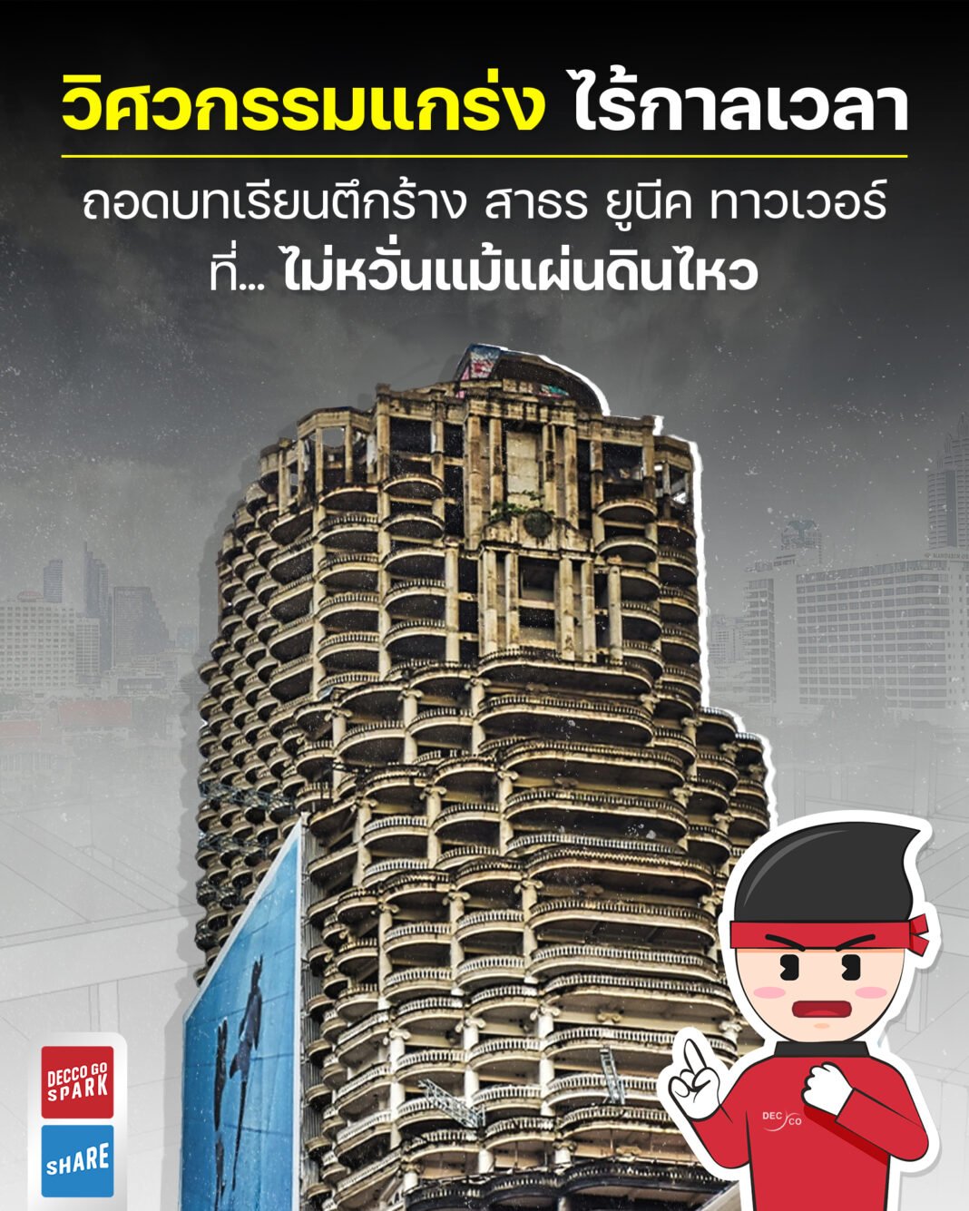 กล่าวง่าย ๆ ก็คือ ตึกนี้ถูกออกแบบ เหมือน “นักรบเกราะเหล็ก” ที่แม้จะไม่ได้ออกไปทำศึกจริง แต่ก็พร้อมรบเต็มรูปแบบ ซึ่งในโลกแห่งสถาปัตยกรรม และการพัฒนาเมือง ตึกสาทรยูนีคเลยไม่ได้เป็นแค่ #ตึกผี อย่างที่ใครหลายคนเรียก แต่เป็นเสมือน หนังสือเรียนเล่มใหญ่ ที่เปิดให้เราได้ศึกษาทุกครั้งที่มองขึ้นไป และจากเหตุกาณ์ที่ผ่านมา มันก็ยิ่งให้บทเรียนเราได้ชัดเจน